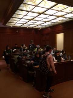 国会議事堂の見学が終わり、憲政記念館の見学も終わり、お昼ご飯も食べ終わり、今、みんなでのんびりお昼休みを過ごしています。この写真は、憲政記念館の中での様子です。