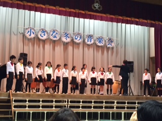 12日土曜日.甲ノ原青少対主催で、甲ノ原中学校に於いて、小さな冬の音楽会が開催さました。本校は5年生が出演しました合唱:ほらね、合奏:HANDSの2曲を披露しました。地域の方々から沢山褒めていただきました。ありがとうございました。