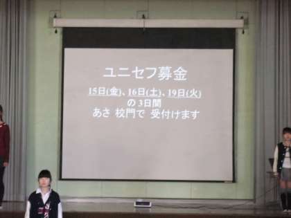 昨日の児童集会は、ユニセフ集会でした。代表委員のみなさんが、ユニセフ募金を呼びかけました。