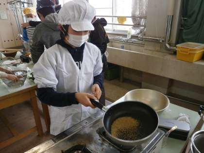先日、6年生が家庭科の調理実習でお弁当作りを行いました。栄養士さんがたくさん指導してくださいました。子供たちもよく頑張っていました。