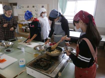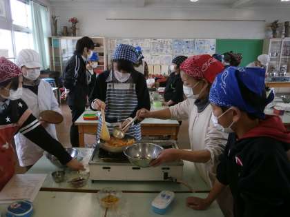 先日、6年生が家庭科の調理実習でお弁当作りを行いました。栄養士さんがたくさん指導してくださいました。子供たちもよく頑張っていました。