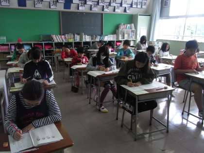 6年生は、いつもの授業と違い、緊張感いっぱいで、真剣に問題に取り組んでいました。