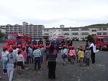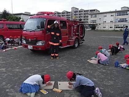 予想外の特別サービスを受け、子供たちも大きな声で、来ていただいた消防署員や消防団の皆様にお礼を言うことができました。【校長】