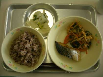 今日の給食は、雑穀(ざっこく)ごはんです。赤米、黒米、きびを