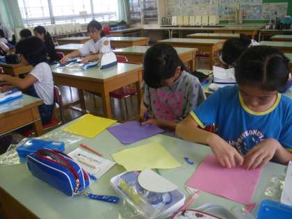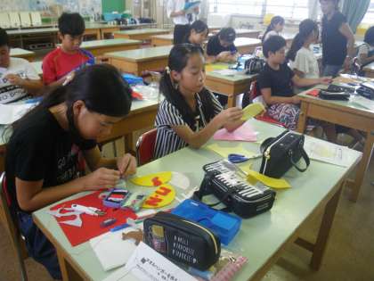 家庭科の学習では、フエルトを使ってタオルハンガーを作成中です。