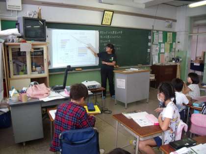 子供たちは、グラフを見て、気付いたことをまとめ、グループで交流しています。