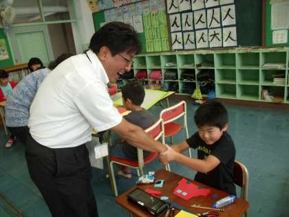 見知らぬ方が来て、教員も子供たちも一瞬ギョッとしますが、