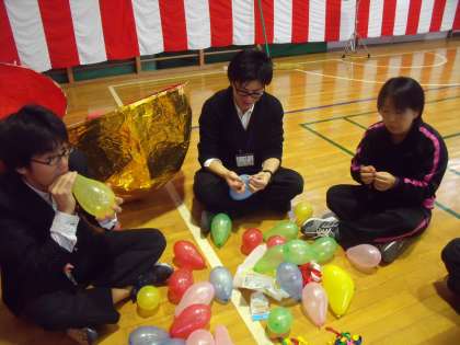 昨日のリハーサルでいったん割れたくす玉を本番用に作り直しです。