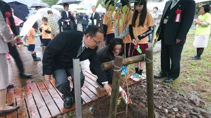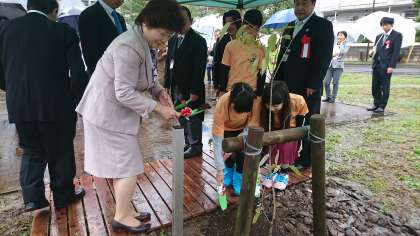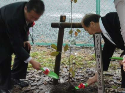 記念式典の第1部終了後、第2部が始まるまでの間を使って、八王子市市制100周年記念植樹式を行いました。