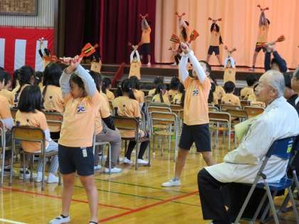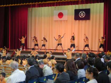 来賓の皆様の手前1mほどの近さで迫力ある踊りが披露され、大きな拍手が送られました。【校長】