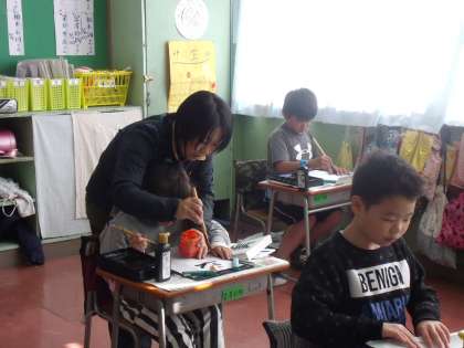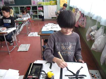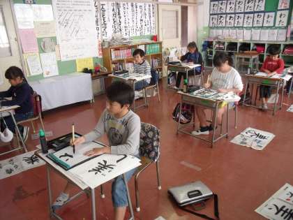 4年生は、そんなきれいな青空を見ながら、書き初め練習に取り組んでいます。