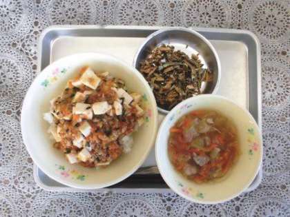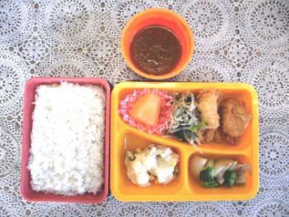 献立は、ごはん・チキンフリッター・青菜のナムル・かぶのベーコン煮・ミルクポテト・りんご缶・カレーでした。