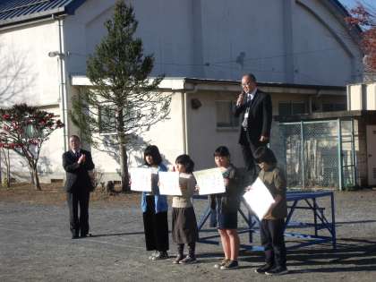 また、市制100周年記念事業「小・中学生作文コンテスト」で入賞した児童の表彰も行いました。【校長】