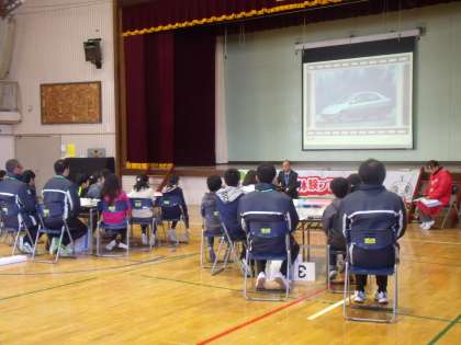 ハイブリッドカー、電気自動車などの先進技術について、クイズを織り交ぜながら、楽しく学ぶことができました。【校長】
