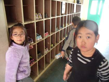 休み時間や体育の授業から戻ってくる子供たちを待ち伏せし、ちゃんと靴を揃えているか確認です。