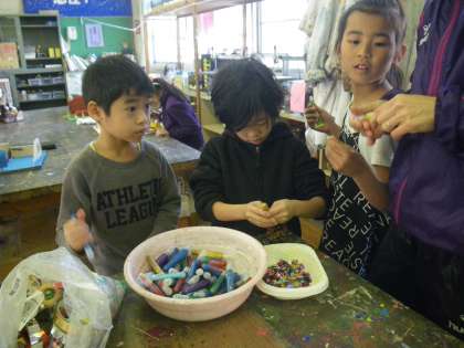 「こっぱだいへんしん」のしあげが終わった子から「ミニミニツリー」を作成していました。中野北小の南門のところの松の木のまつぼっくりを使って、きれいに装飾をしていました。図工室もクリスマスソング♪が流れていました。