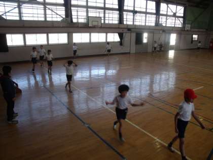 ただし、今日は、短なわを使い、跳びながら走っています。