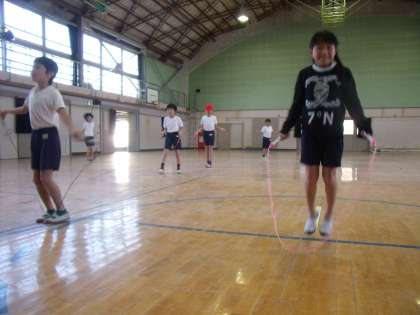 担任の「前回し50回〜!」のかけ声とともに跳びはじめる子供たち。