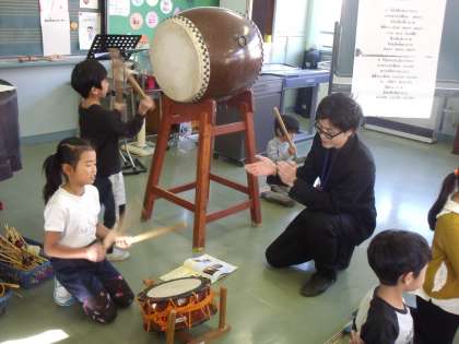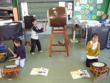 日本の太鼓の音に親しむ学習のようです。