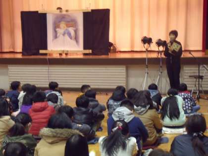 大型絵本、音楽、中井 貴惠さんの朗読に感情移入し、物語後半では、子供たちだけでなく、「なかきた家族」の方も涙を浮かべていました。