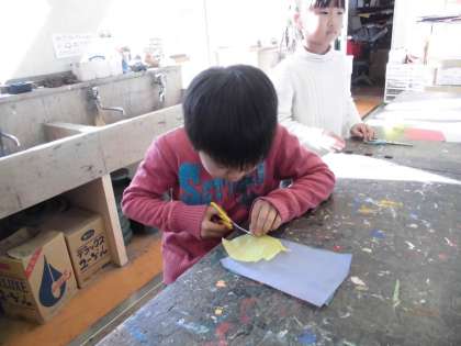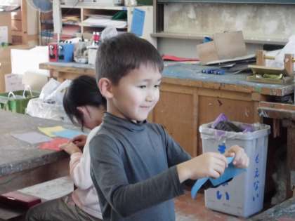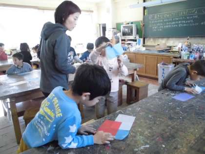 ティッシュペーパーのように薄い紙にいろいろな色があるので、1年生は興味津々です。