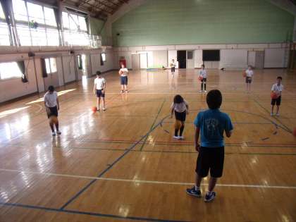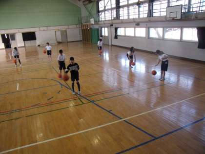 体育館に行ってみると、5年生が、バスケットボールを使って、ドリブルをする練習をしていました。