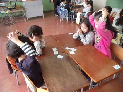 2年生が、生活科で、昨日の福笑いに続き、百人一首で遊んでいます。