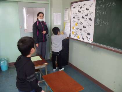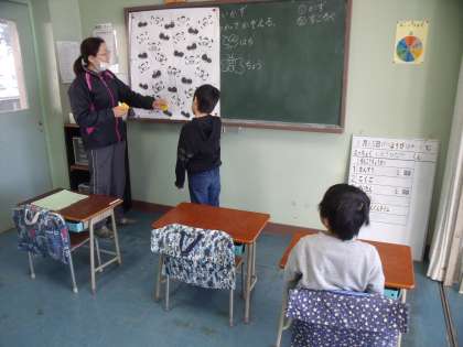 あさひ学級の1年生が、グループ学習で算数の授業を受けています。