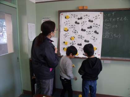 黒板にたくさんの「ちょう」や「はち」が飛んでいる絵が貼られていますが、それぞれ何匹いるのか数える課題のようです。
