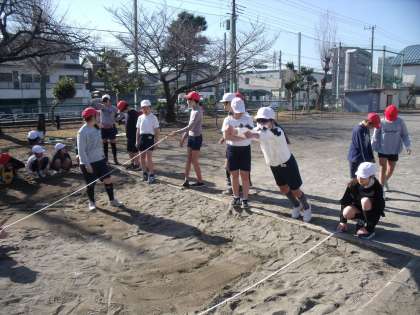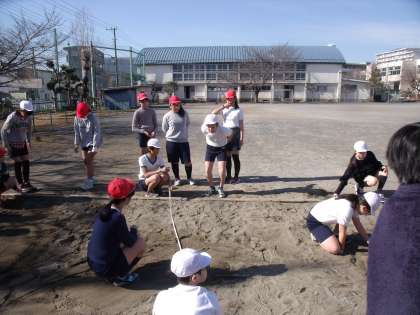 走り幅跳びと違い、助走がありませんから、踏み切りの強さと正しい空中姿勢が距離を伸ばすポイントです。