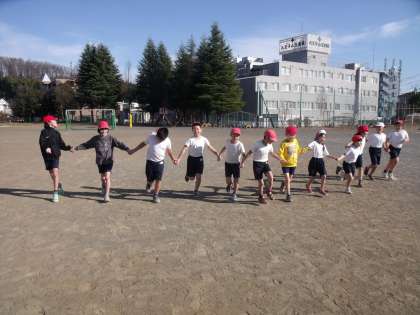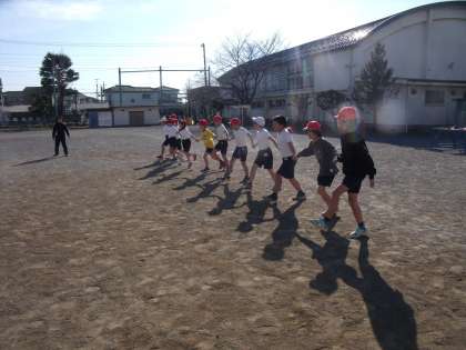 途中からは、難易度が少し上がって、学級全員で手をつないでスキップをしたり、ダッシュをしたりします。