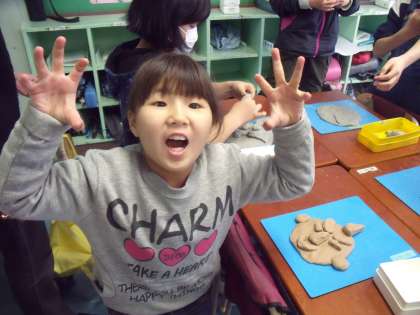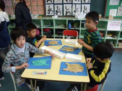 あさひ学級では、図工の時間に粘土を使って、オニの顔を作っています。