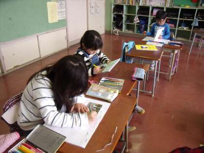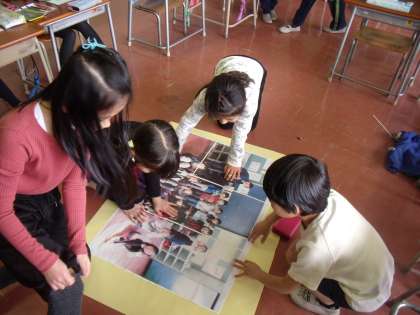 2年生のまとめということで、最近のクラス集合写真の掲示を作っている子たちがいます。