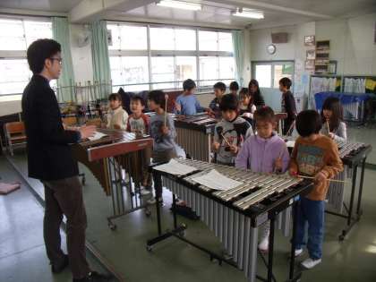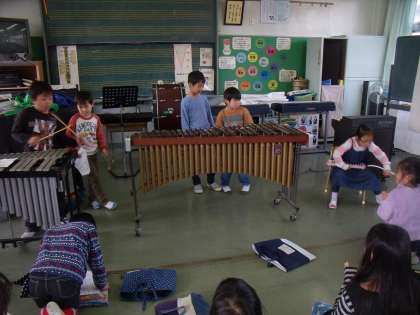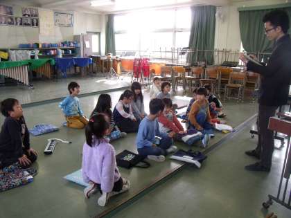 「きらきらぼし」の曲の間に自分の作った旋律をはさみ込み、「ほしのおんがく」を作る活動に取り組んでいる1年生。