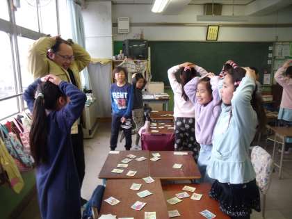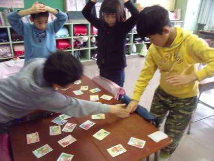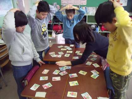 子供たちの机の上には、たくさんのかるたの絵札が置かれています。