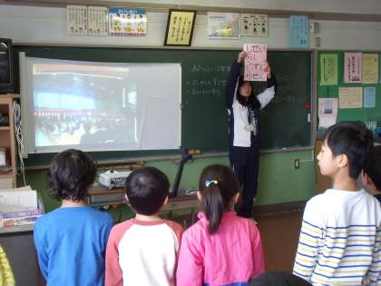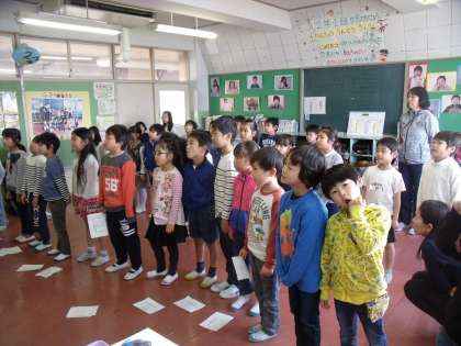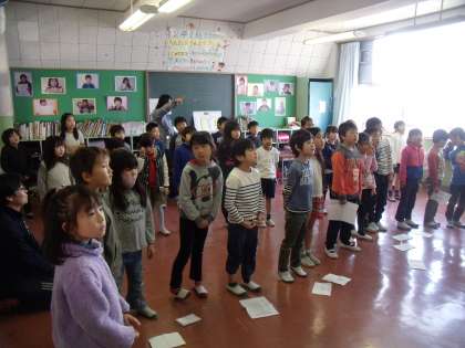 4・5・6年生が卒業式の練習をしている1校時、2年生の教室に1・2年生が集まって来年度の入学式に向けた合同練習をしています。