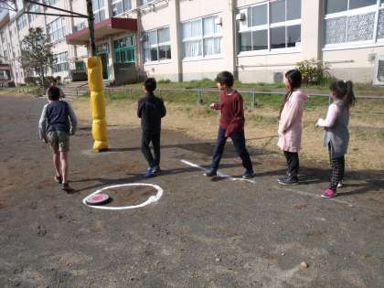いくつかの直径50cmほどの円を描き、定められた線から玉(今日はフリスビーや紅白玉)を投げます。円の中に入った得点を競う遊びです。