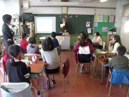 5年生の教室では、この1年間に学習した英語表現のまとめをクイズ形式で行っています。
