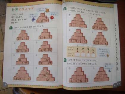 ちょっと説明しにくいのですが、3枚目の写真にあるとおり、一番下の段にある隣同士の数字をたして、その答えを上の段に書いていくものです。