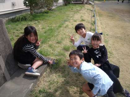 1年生数人が、校舎前の芝生のところに集まっています。