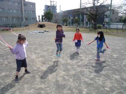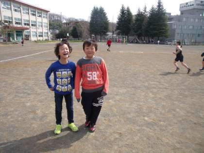 1年生たちも、春の日差しがいっぱいな中で、短なわやサッカーなどで楽しく過ごしています。【校長】