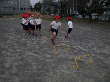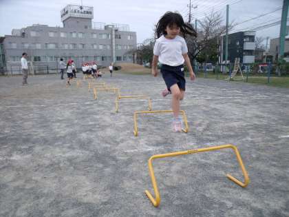 しかし、曲がったところで足をとられ、ミニハードルを倒している子も目立ちます。