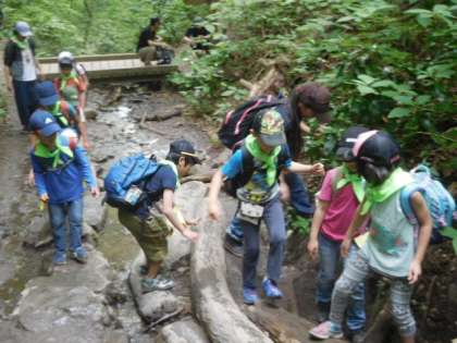水が流れる石の上を上手に歩いていきます。安全な道を考え、時には手を貸してあげることも