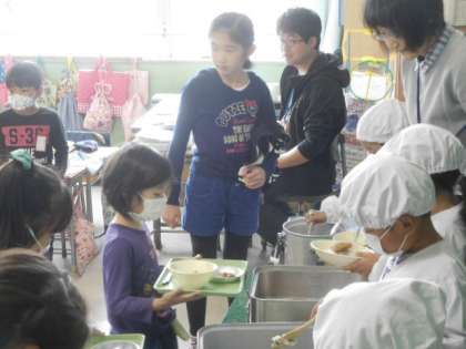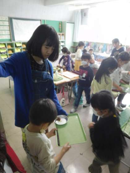 など、優しい声をかけながら1年生が自分で当番活動ができるよう声をかけています。