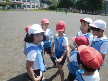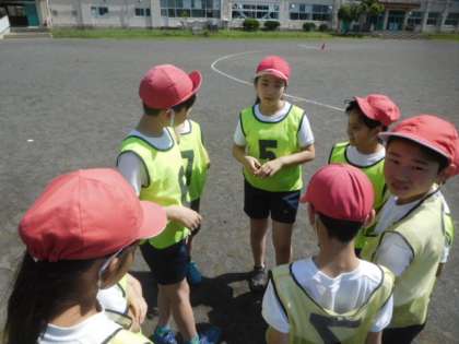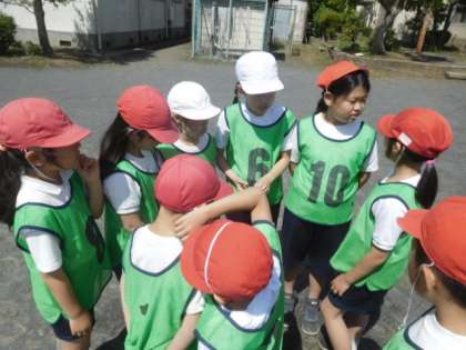 4年生が中心となって、バトンパスのやりやすさや走るスピードなを考えます。