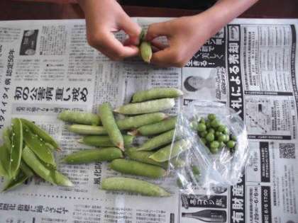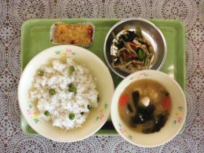 今日のグリーンピースごはんは、昨日2年生がさやむきをしてくれたグリーンピースを使用しました。グリーンピースは、野菜ですが、熟すと豆になる食べ物です。おなかの調子をよくする「食物繊維」、体の調子を整える「ビタミン」がたくさん含まれ、栄養たっぷりです!