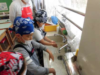 作り方を教えてもらい、いざ、実習!でもその前に、身支度をして、手洗い!です。