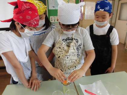 手洗い、そしてアルコール消毒も終わり、さて、実習です。手作りマヨネーズを作ります。