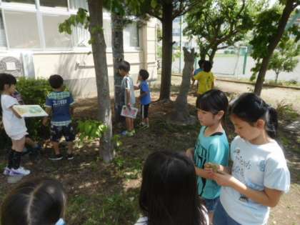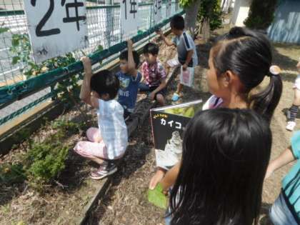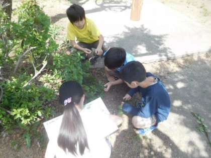 校庭にクワの葉が本当にあるのか調べます。