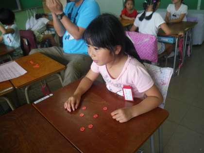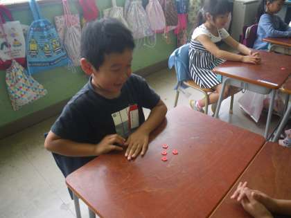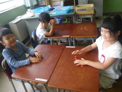 この時期の1年生は、数字は唱えられるのですが、数の大きさをしっかり理解していない子もいます。ですから、このゲームでは、友達のおはじきを見て、同じように自分も並べ、残った数を数えるという方法で答えを見つけることで、自分の数えた数字と数の大きさを一致させることができるのです。